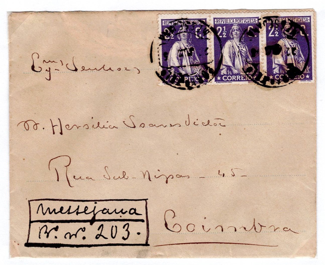 Letter sent registered on 22.6.1915, by Messejana post office /R°. n°. 203 and addressed to Coimbra.