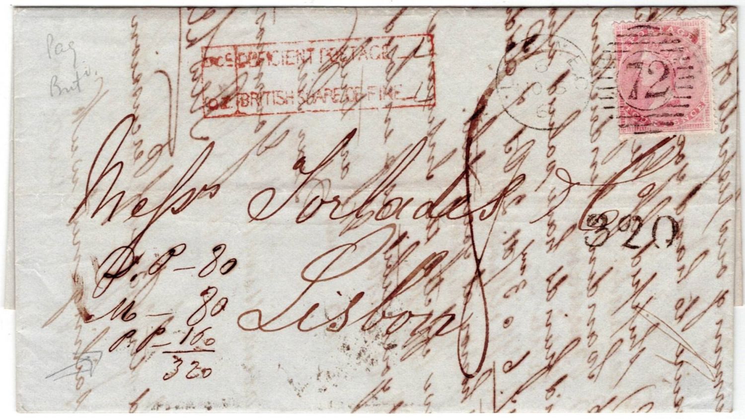 2348 imageShipped from London on November 6, 1861, insufficiently franked to 4d, bearing the postage mark and fine in London, for the amounts of 4d and 4d, respectively. The missing postage and fine were handwritten in Portugal, with "PP" and "M," both for 80 reis, to which was added the Portuguese postage of 160 reis, for a total of 320, handwritten and printed on the letter. Arrived in Lisbon on November 14, 1861.(Image 1)