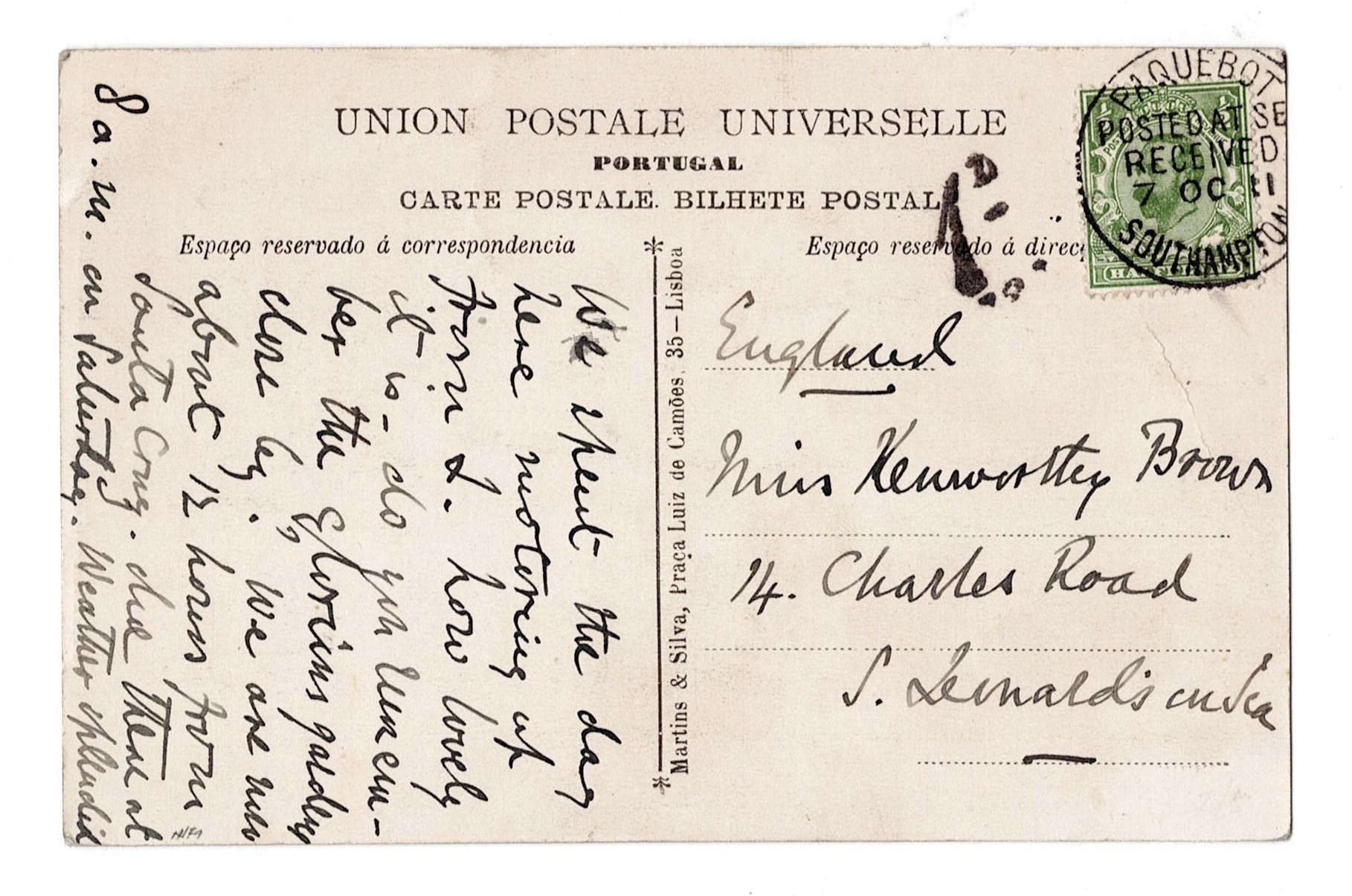 2349 imageEngland Sea Mail. English. Picture postcard of Cintra written from on board, where it was launched, marked “PAQUEBOT POPSTED AT SEA”, received on 7.10. Insufficient postage of 1/2d, postage at 1d.(Image 1) (Image 2)