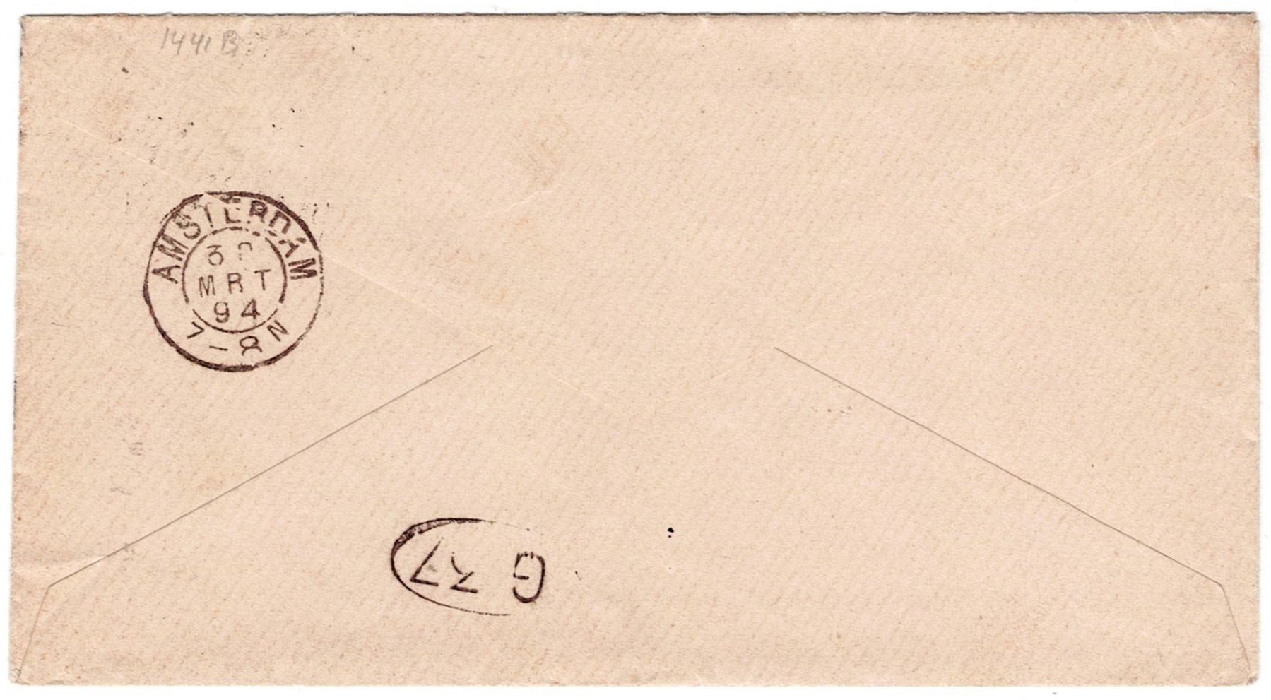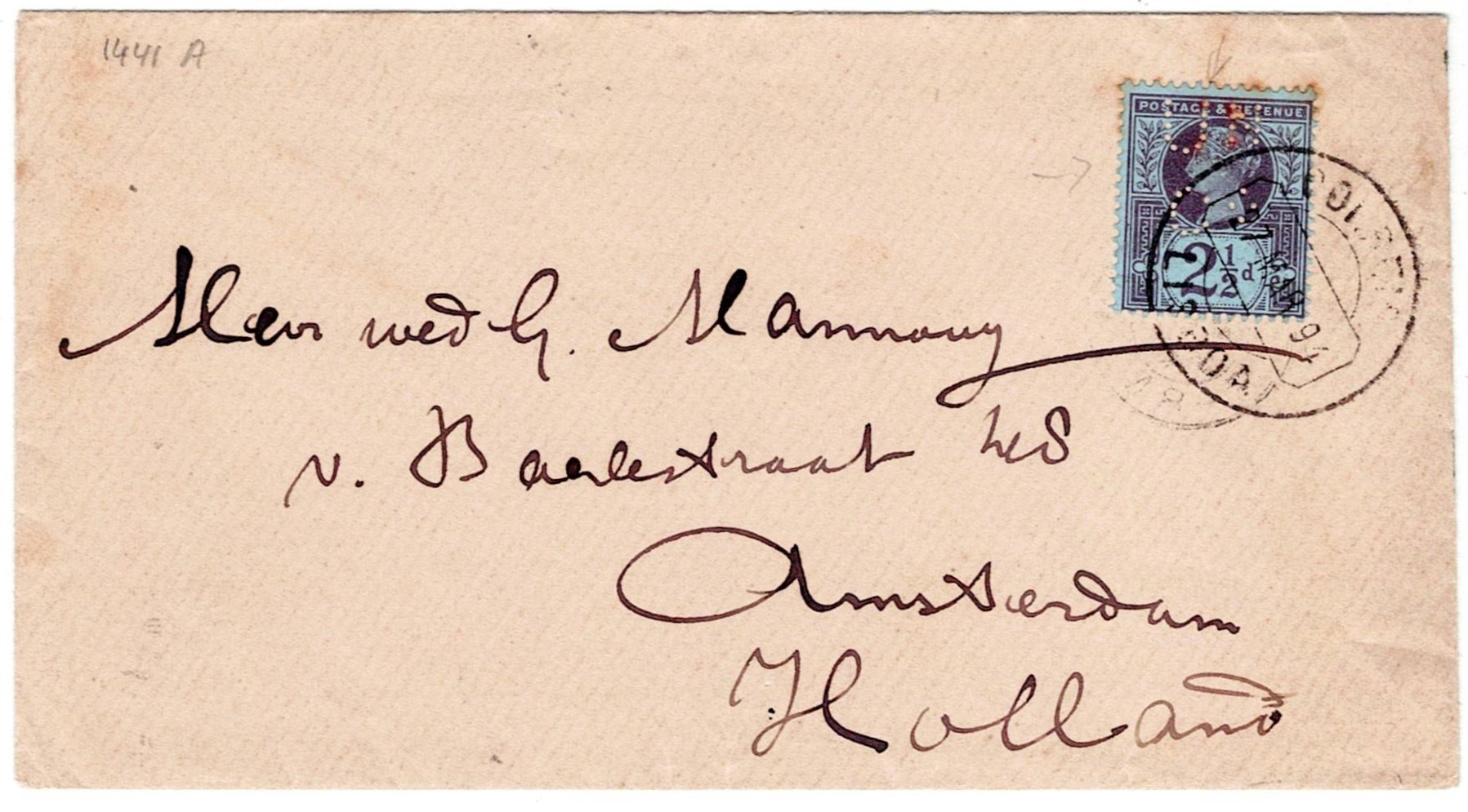 2350 imageEngland. Perfins. Letter franked with 2 ½ d stamp, with perfin “UN/O” unused in the Lisbon post office on 7.3.1894, unloaded from a ship, to Amsterdam 30.3.(Image 1) (Image 2)