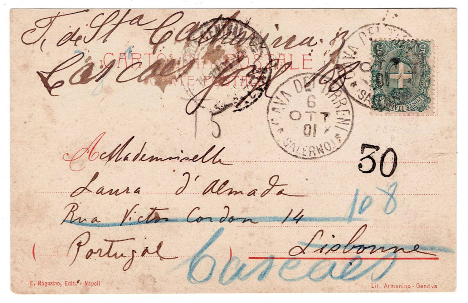 2352 imagePostage due. Illustrated postal from Naples, sent on October 6, 1901. Insufficient postage of 5 centesimi, to Lisbon. Postage due at departure in T5, so it was postage due on arrival at 30 reis.(Image 1)