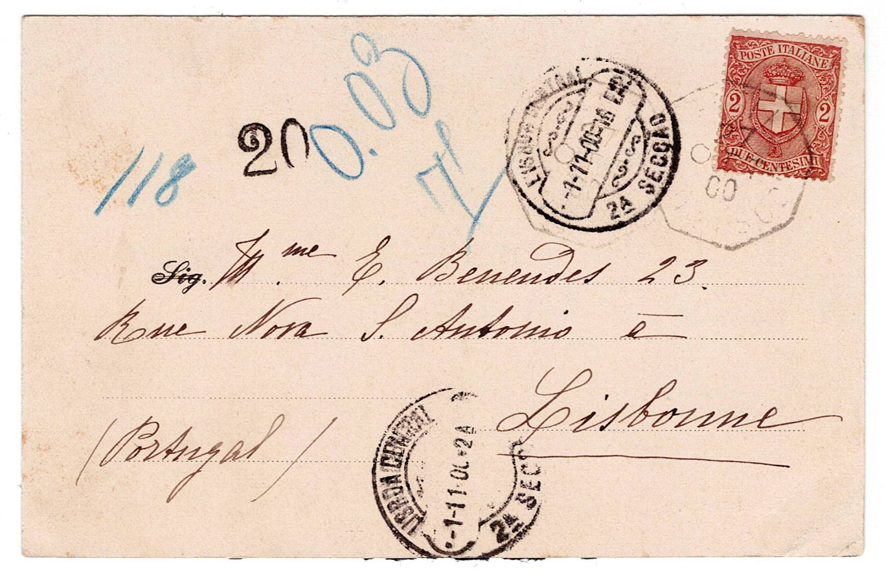 2353 imagePostage due. Italian illustrated postal, sent on October 27, 1900, insufficient postage of 2 centesimi to Lisbon November 1, 1900. Postage due at departure in T0.03, so it was postage due on arrival at 20 reis.(Image 1) (Image 2)