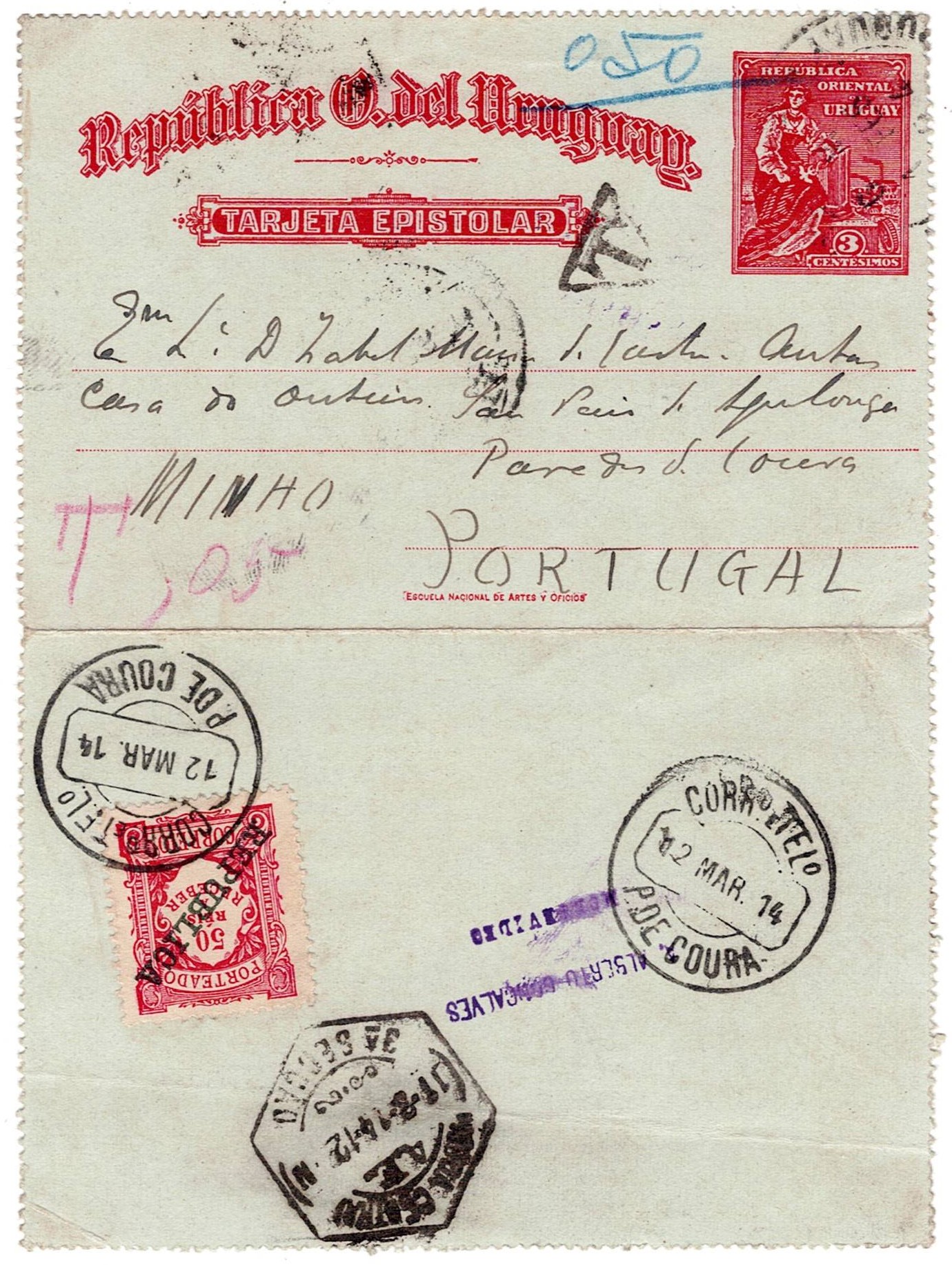 2354 imageUruguay Letter-ticket (whole) from the Uruguayan post office with a printed rate of 3 centesimo (postage due 5 1/2). Sent (19.2.1914) from Montevideo, where it was marked T for insufficient postage (-2½ c.). Addressed to Paredes de Coura - Portugal, it arrives at the Porto post office (11.3) where it was marked 050, double the amount of the missing fee, and forwarded to the destination post office (12.3.) where it was also handwritten T, 05 and the POSTAGE stamp was affixed with an overprint REPUBLIC of 50 reis = 5 cents, paid by the recipient. (Table of the time: 5 centimes of the franc 100 reis 10 centesimo, therefore 5 centesimo.) 50 reis/5 centavos).(Image 1)