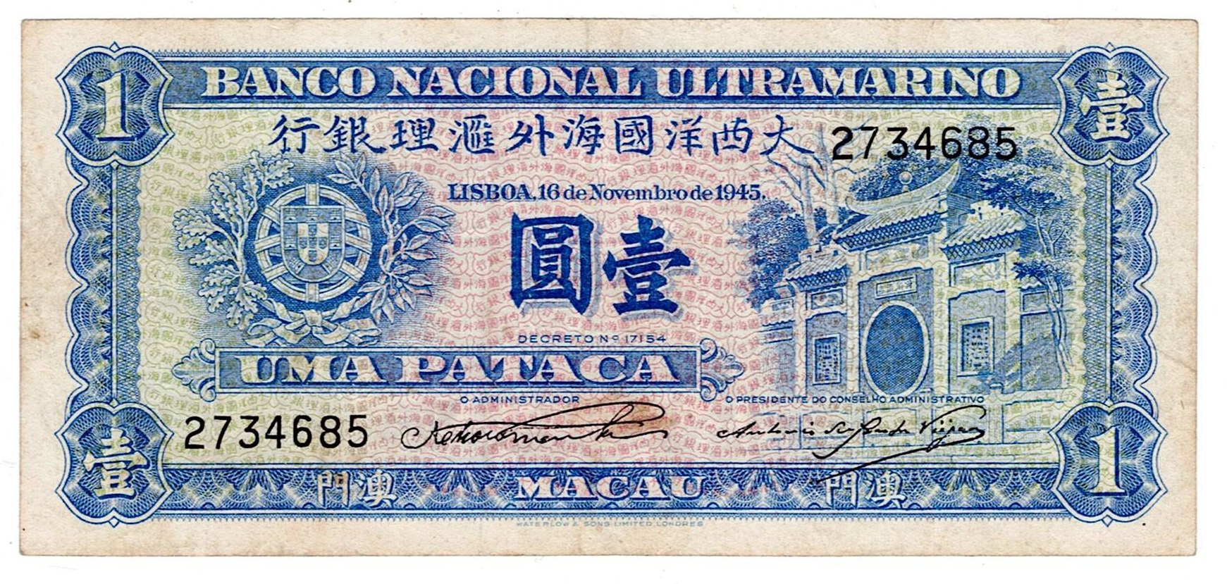 2368 imageVarious Notafilia MACAU. 1 Pataca note, Lisbon, 16 November 1945..(Image 1) (Image 2)