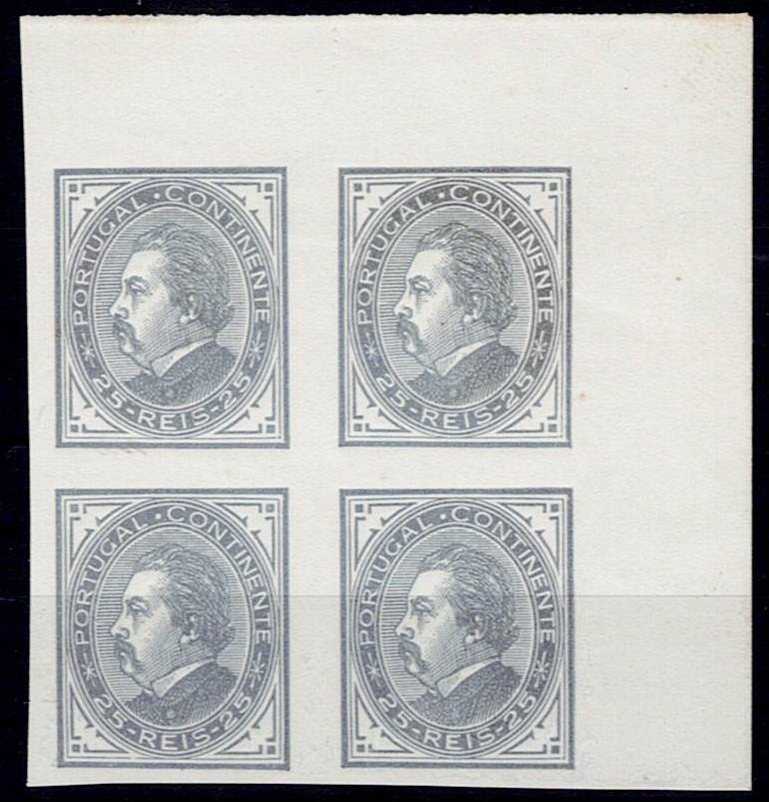 226 imageProofs Portugal 1880-81 D. Luís in profile. BLOCK corner of stamp sheet Mf#54, 25 reis gray. Undented proofs in the approved color, ungummed, without defects or repairs, in good color. Good.(Image 1)