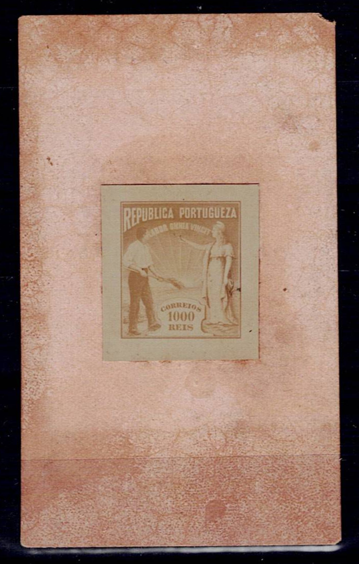229 imagePortugal 1911 Proofs Studies and drawings for the new seal representing the republican regime. Photographic proof of an unapproved design for a 1,000 reis (!) stamp, unperforated, greenish, with the inscription "LABOR OMNIA VINCIT." Pasted on cardboard. By an unknown author.(Image 1)