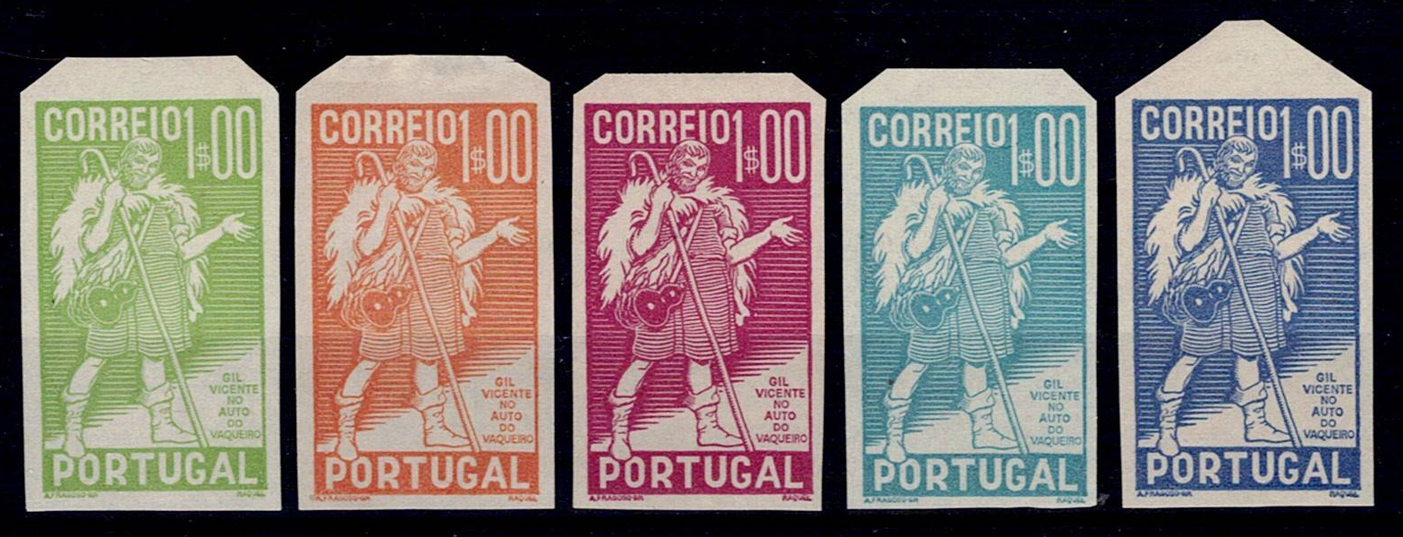 231 imageProofs Portugal 1937 4th Centenary of the Death of Gil Vicente. Lot with 5 color proofs of stamp Mf#578 in light green, orange, carmine, light blue and dark blue, not perforated. MB and R.(Image 1)