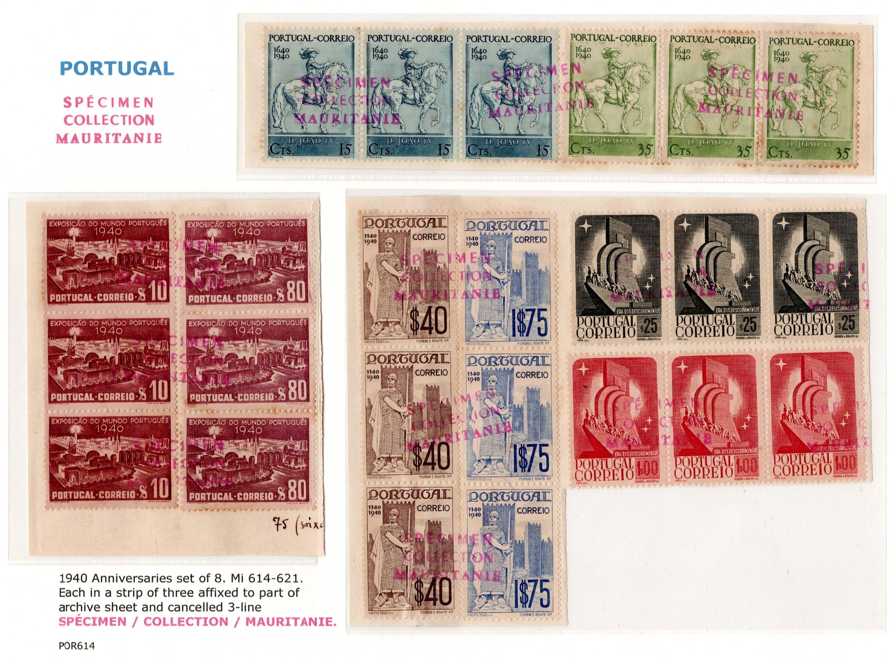 232 imagePortugal 1940 8th centenary of the Foundation and 3rd centenary of the Restoration of Portugal. Mf#591-598. Complete series in strips of 3 stamps, canceled with a violet stamped "SPECIMEN / COLLECTION / MAURITANIE". Copies taken from the stamp collection of the Mauritanian Postal Administration. The only possible set.(Image 1)