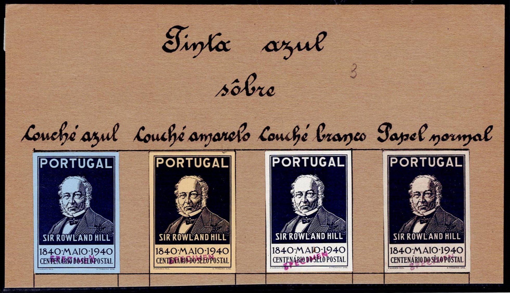 233 imagePortugal 1940 Proofs – 1st Centenary of the Postage Stamp. Drawing by Pedro Guedes and engraving by Arnaldo Fragoso. Lot containing four unperforated color proofs in black on four different types of paper: blue coated paper, yellow coated paper, white coated paper, and plain paper; all with the red "SPECIMEN" overprint on the bottom edge of the proof, glued to brown cardboard.(Image 1)