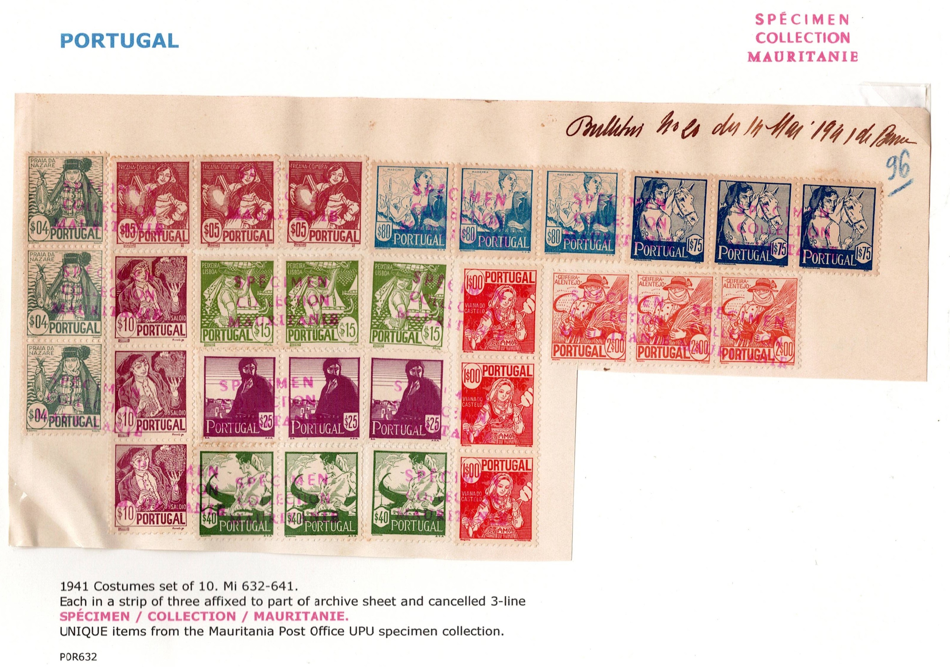 234 imagePortugal 1941 Portuguese Costumes. Mf#607-616. Complete series in strips of 3 stamps, canceled with a violet stamped "SPECIMEN / COLLECTION / MAURITANIE". Copies taken from the stamp collection of the Mauritanian Postal Administration. The only possible set.(Image 1)