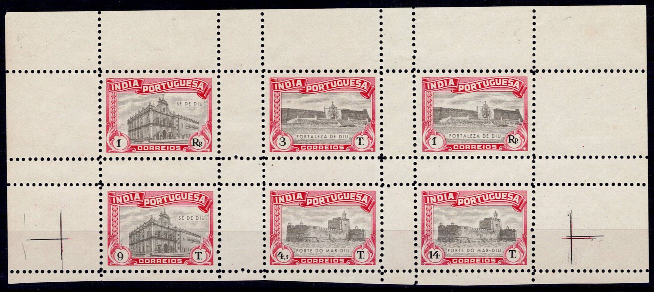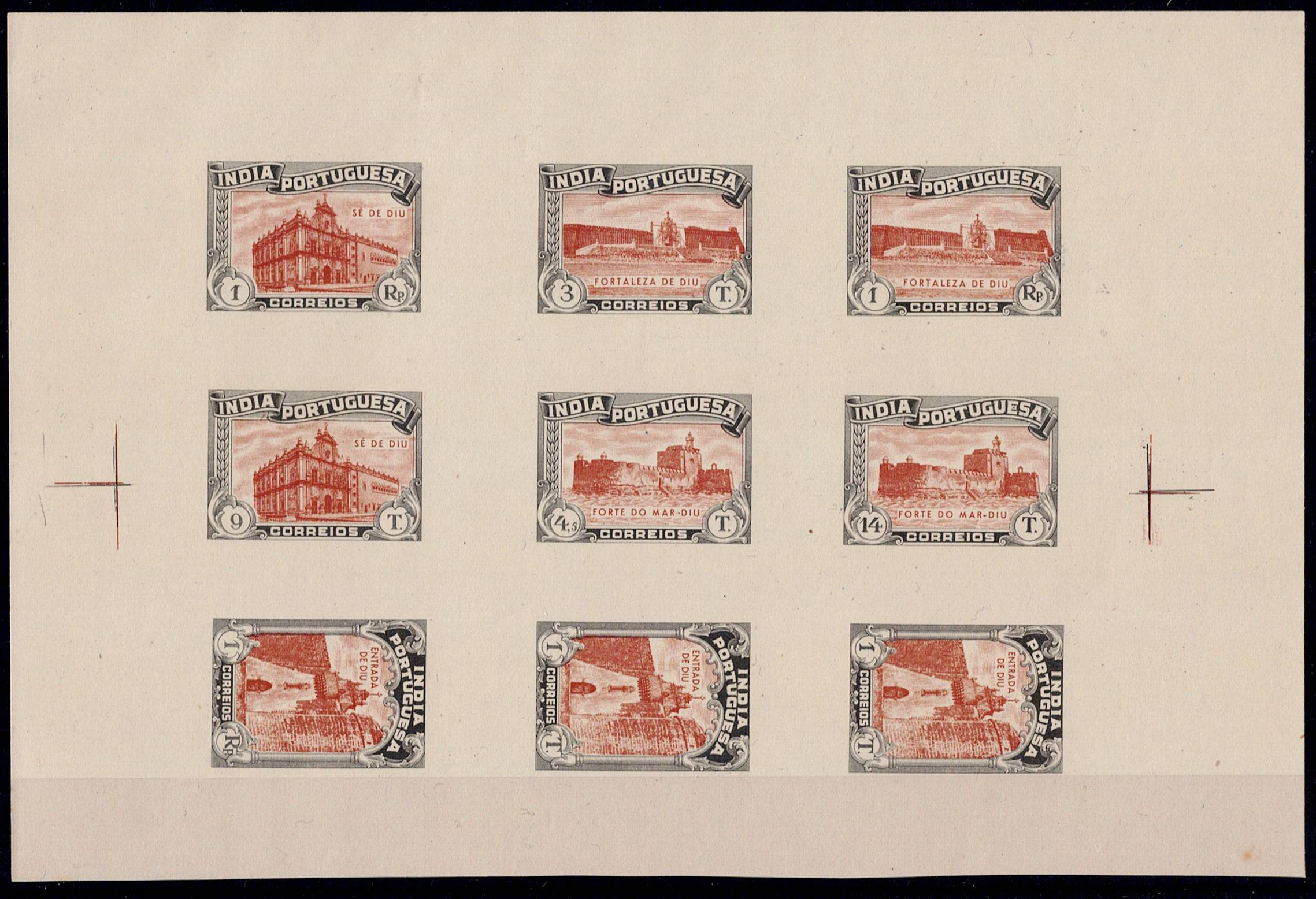 239 imageIndia Proofs 1948 Monuments of Diu. Projected issue. Block measuring 190x83mm, on smooth paper, with 6 color proofs, notched, in red and gray, in denominations of 1Rp (2), 3T, 9T, 4.5T, and 14T, with engravings of the Diu Cathedral, Diu Fortress and Fort of the Sea – Diu. Unrepaired copy, with original gum. B and R.(Image 1)