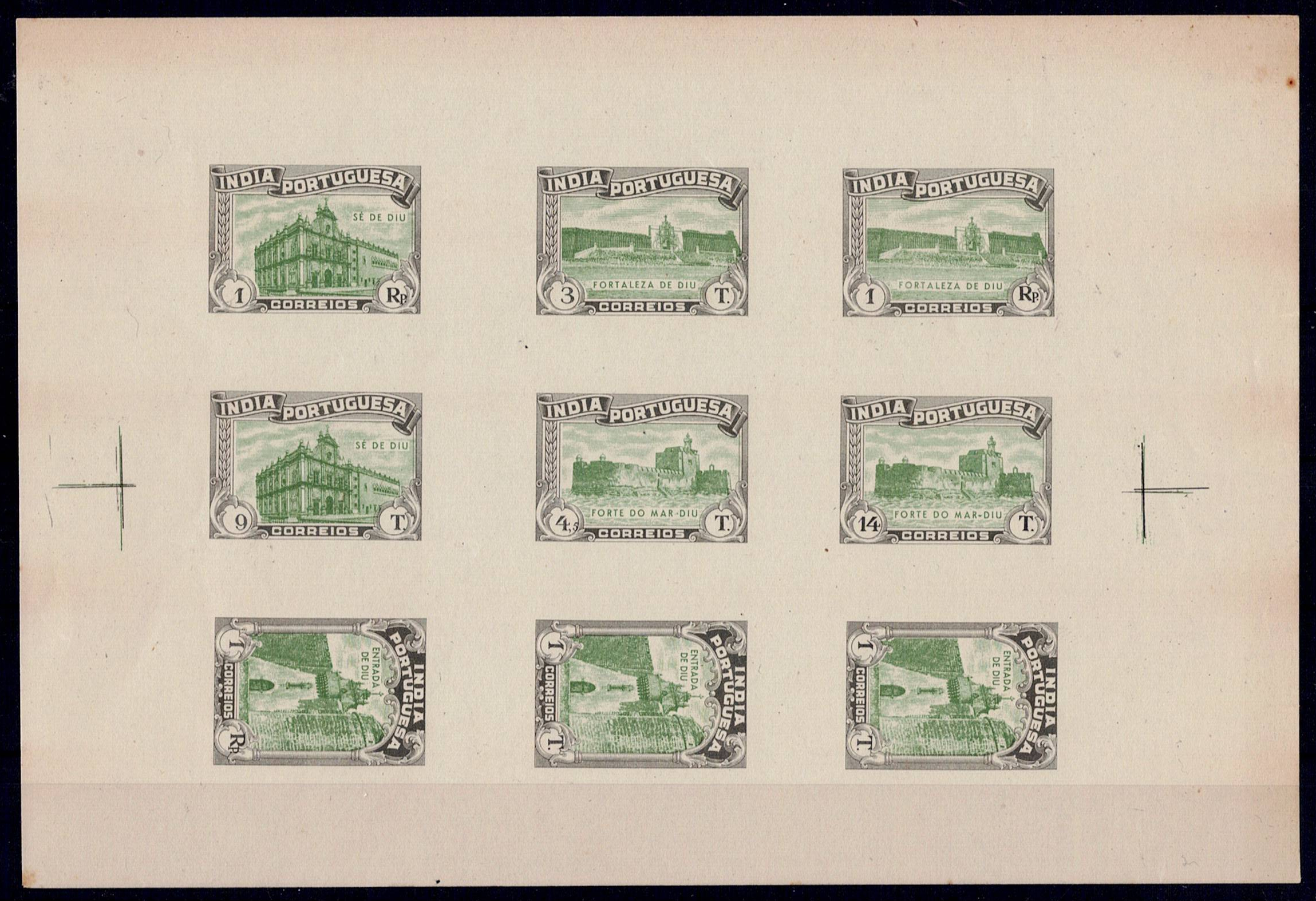 237 imageIndia Proofs 1948 Monuments of Diu. Projected issue. Block measuring 190x127mm, on smooth paper, with 9 color proofs, unperforated, in gray and green, in the values ​​of 1Rp (3), 3T, 9T, 4.5T, 14T, 1T (2), with engravings of the Diu Cathedral, Diu Fortress, Fort do Mar – Diu and Diu Entrance. B and R.(Image 1)