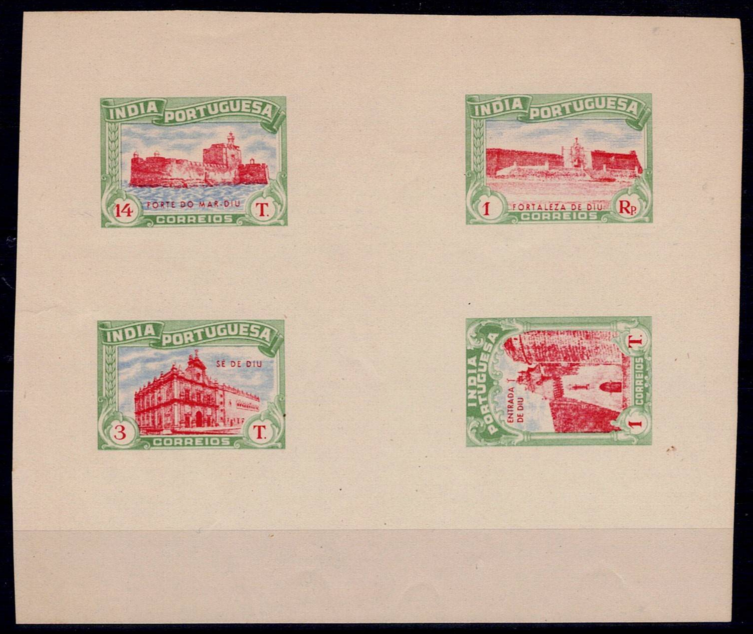 238 imageIndia Proofs 1948 Monuments of Diu. Projected issue. 125x105mm block, on smooth paper, with four unperforated color proofs in light green and red, denominations of 1Rp, 3T, 1T, and 14T, with engravings of the Diu Cathedral, Diu Fortress, Diu Entrance, and Sea Fort – Diu. Unrepaired copy, with original gum. B and R.(Image 1)