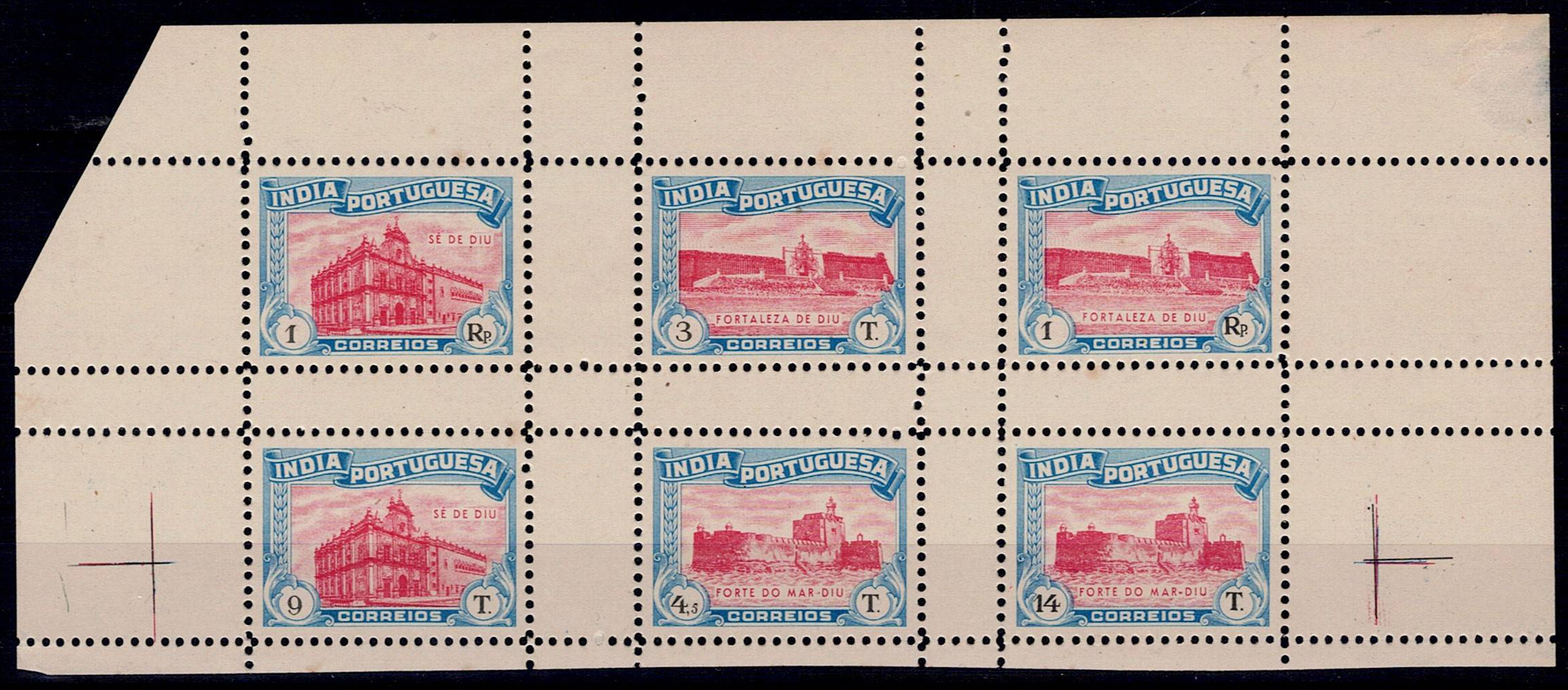 240 imageIndia Proofs 1948 Monuments of Diu. Projected issue. Block measuring 190x83mm, on smooth paper, with 6 color proofs, perforated, in blue and carmine, in the values ​​of 1Rp (2), 3T, 9T, 4.5T, and 14T, with engravings of the Diu Cathedral, Diu Fortress and Fort of the Sea – Diu. Copy without repairs, without gum. B and R.(Image 1)