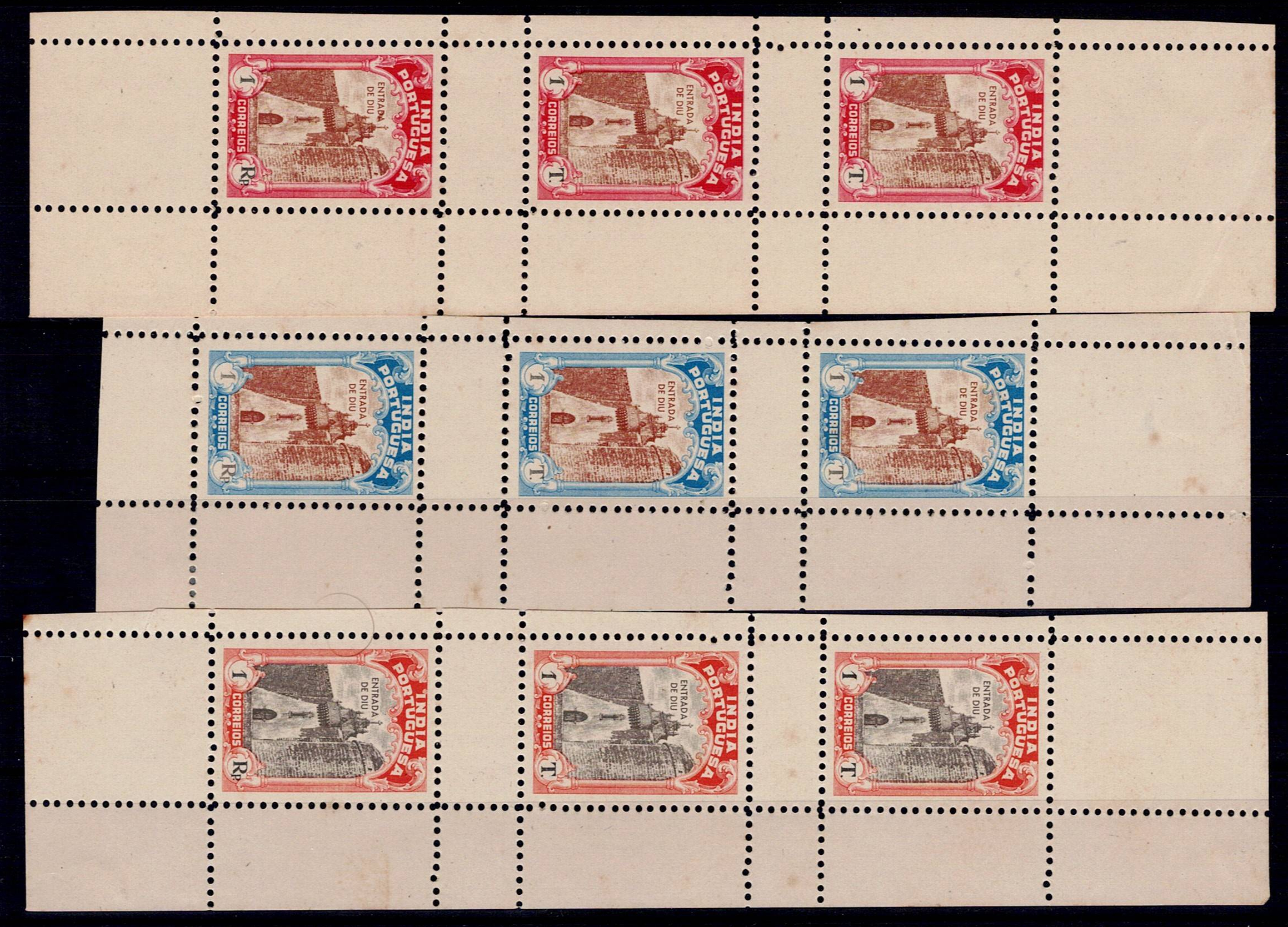 241 imageIndia 1948 Diu Monuments Proofs. Projected issue. 3 blocks on smooth paper, with 3 color proofs, perforated, in blue and brown, orange and brown, and red and brown, denominations of 1 Rp, 1T (x2), with engravings of the Entrance of Diu, perforated, with separators between the proofs, ungummed, without defects or repairs, in good color. B and R.(Image 1)
