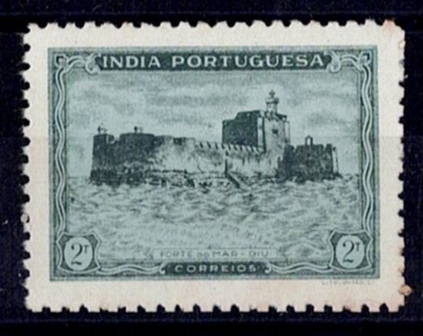 242 imageIndia Proofs. 1 color proof, perforated, for unissued India stamps: Forte do Mar - Diu, 2 dark green thongs. Proof with irregular perforation, good color, no gum, and a slight trace of oxide.(Image 1)
