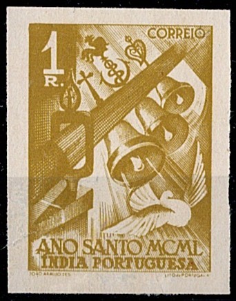 243 imageIndia * 1950 – Holy Year. Drawing by João Araújo. MF405, 1 real. Color proof in greenish bistre on enamel paper, not approved for issue, not dented, not gummed. Copy without defects or repairs, with good color.(Image 1)
