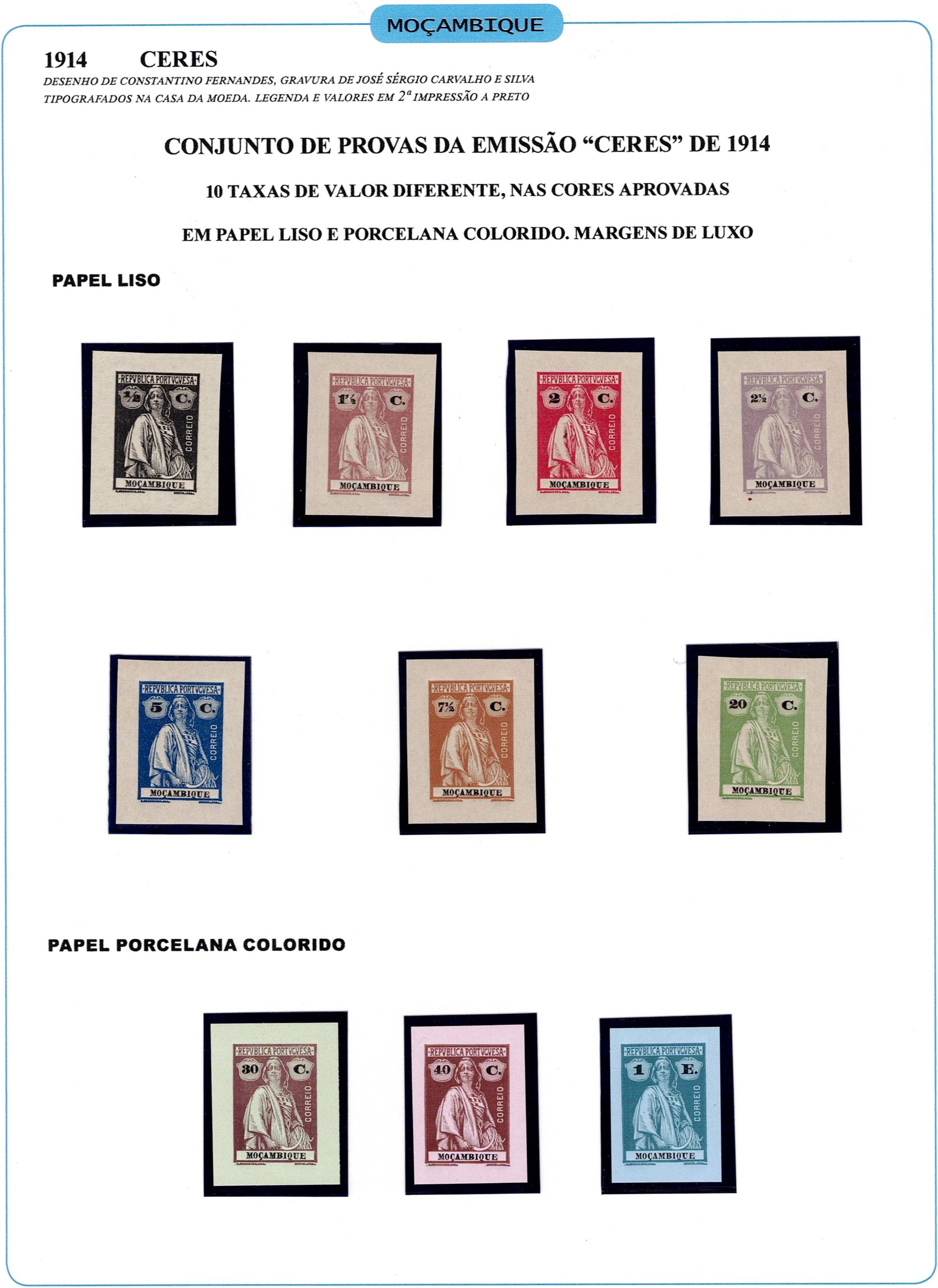 244 imageMozambique 1914 Ceres Proofs. Set of 10 individual, unperforated proofs of varying rates, mounted on a collector's sheet, on smooth paper and porcelain with luxurious margins. Good.(Image 1)