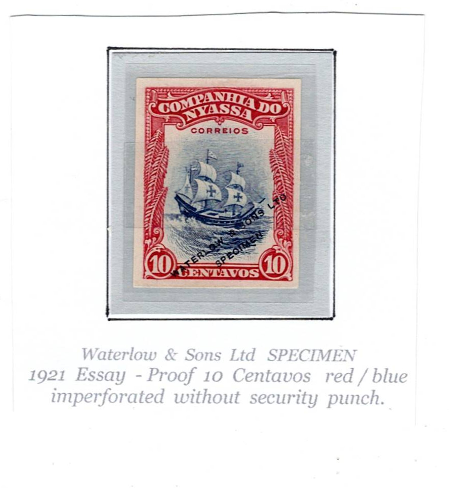 245 imageNIASSA Company Proofs. Proof of the 10-cent Caravela stamp, with an oblique SPECIMEN overprint by Waterlow & Sons Ltd, unperforated, and without security holes. MB and R.(Image 1)