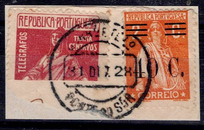 351 imagePortugal 1928 Ceres Surtaxed + Assistance BIPARTITE. Stamp Mf#IP8, 2 c. BIPARTITE with Ceres 40 c. w/o 2c. on a paper fragment. Used copy, with CCD "PONTE DO SOR" dated "31 DEC. 28".(Image 1)