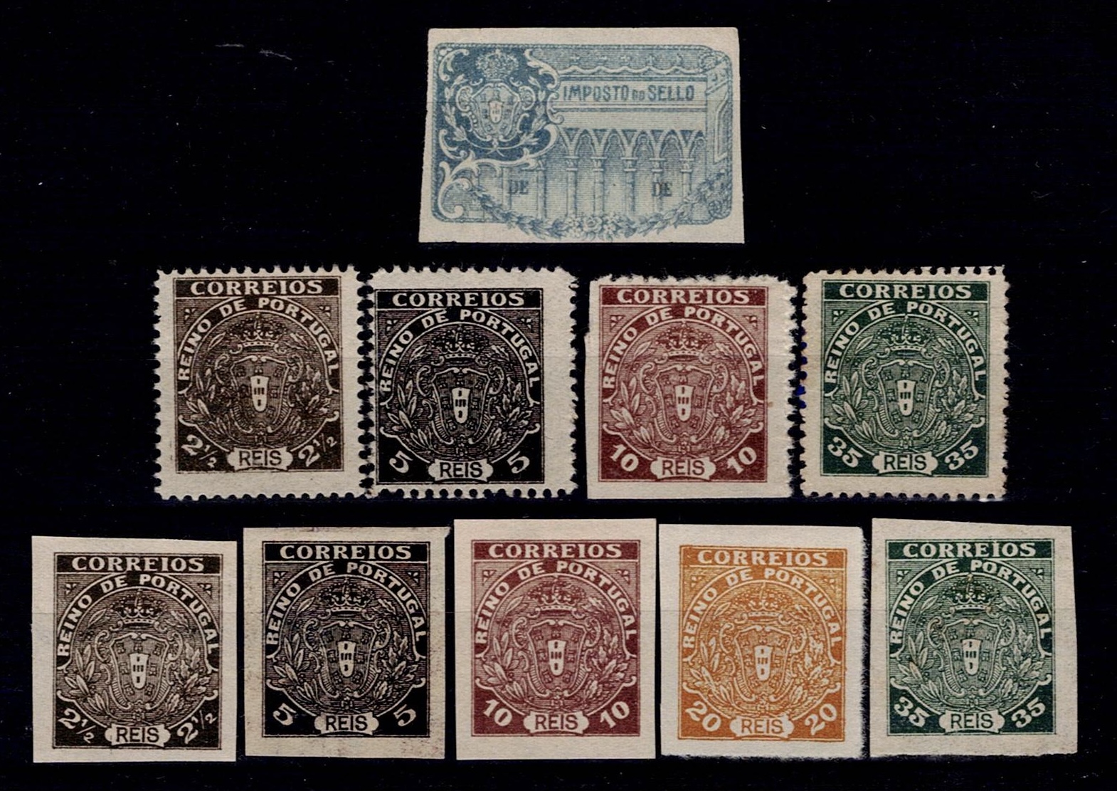 354 imagePortugal 1919 Northern Monarchy. Set of 5 unperforated stamps Mf#ND1-4 + 20 yellow reis + 4 unperforated Mf#ND1-4 stamps + Unperforated revenue stamp in blue. Copies on smooth yellowish paper, with or without gum and hinge: 2 1/2 reis in sepia black, 5 reis in black, 10 reis in brown, 35 reis in green and 20 reis in yellow.(Image 1)