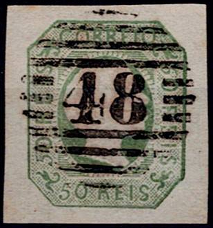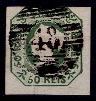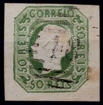 357 imageAzores 1855-56 Precursors – D. Pedro V, STRAIGHT hair. Mf#8, 50 réis, green, smooth paper. Used copy, 4 very good / good margins , in good colour, without defects or repairs, obliterated with a 4-3-4 type stamp struck in black “48 – ANGRA (AZORES)”. Catalogue value € 170 .(Image 1)