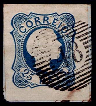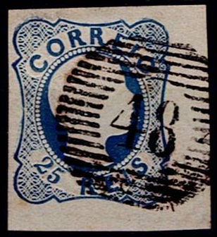 360 imageAzores 1856-58 Precursors – D. Pedro V, RINGED hair. Mf#12, 25 réis, blue, smooth paper, DOUBLE lines. Used copy, 2 good margins and 2 short, with good color, 1 spot of dirt on the back without repairs, obliterated with a 20-bar stamp struck in black “48 – ANGRA (AZORES)”. Catalogue value €130.(Image 1)