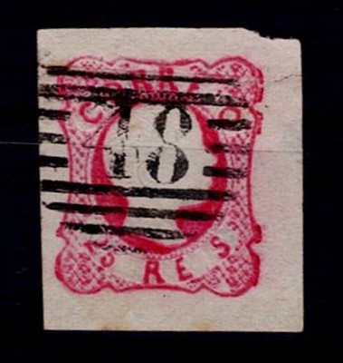 361 imageAzores 1862-64 Precursors – D. Pedro, curly hair. Mf#13, 25 réis, pink carmine, smooth paper. Used copy, with 4 normal to good margins, with a horizontal crease and a tear on the right side that reaches the frame, without repairs. Obliterated seal with a 4-3-4 type postmark struck in black “48 – ANGRA (AZORES)”. Catalogue value €45.(Image 1)