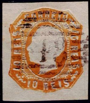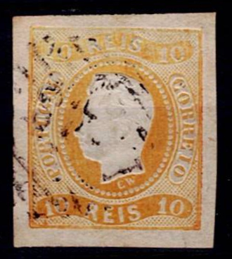 362 imageAzores 1862-64 Precursors – D. Luis I Borja Freire. Mf#15, 10 réis, yellow-orange, smooth paper. Used copy, 4 good to normal margins, with good colour, no repairs, obliterated with a 4-3-4 type stamp struck in black “48 – ANGRA (AZORES)”. Catalogue value € 140 .(Image 1)