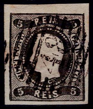 364 imageAzores 1866/67 Precursors – D. Luís I. Curved ribbon, not serrated. Mf#19, 5 réis, black, smooth paper, not serrated. Used copy, normal to good margins, with good colour, no defects or repairs, obliterated with a 4-3-4 type stamp struck in black “48 – ANGRA (AZORES)”. Catalogue value € 175 .(Image 1)