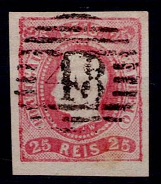 367 imageAzores 1866/67 Precursors – D. Luís I. Curved ribbon, not serrated. Mf#22, 25 réis, carmine, smooth paper, not serrated. Used copy, with good colour and relief, 1 very good margin and 2 short not touching the frame, without defects or repairs, obliterated with a 4-3-4 type stamp struck in black “48 – ANGRA (AZORES)”. Catalogue value €75 .(Image 1)