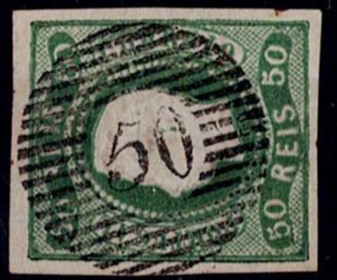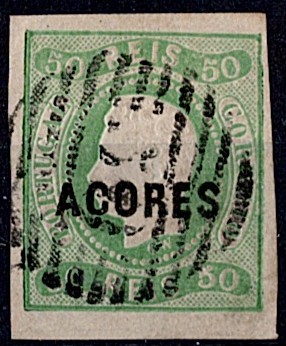 388 imageAzores 1866/67 Precursors – D. Luís I. Curved ribbon, not serrated. Mf#23, 50 réis, green, smooth paper, not serrated. Used copy, 4 short margins, without defects or repairs, obliterated with a 20-bar stamp struck in black “50 – PONTA DELGADA (AZORES)”. Catalogue value €240.(Image 1)