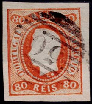 389 imageAzores 1866/67 Precursors – D. Luís I. Curved ribbon, not serrated. Mf#24, 80 réis, orange, smooth paper, not serrated. Used copy, good to very good margins, no defects or repairs, obliterated with a 4-3-4 type stamp struck in black “50 – PONTA DELGADA (AZORES)” Catalogue value €285 .(Image 1)