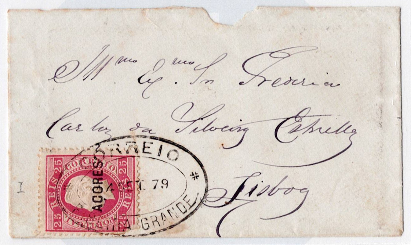 391 imageAzores. small 25 Reis postage envelope, straight ribbon, notched, one corner defective, sent from Ribeira Grande on September 4, 1879 to Lisbon, arrival on September 21(Image 1)