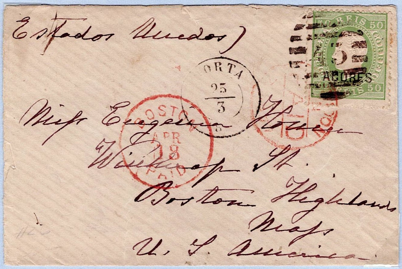 392 imageAzores. letter sent from Horta on March 25, 1877, to Boston, postage of 50 Reis D. Luís, right ribbon, obliteration of bars 45, via London, arrival in Boston, April 18. MB(Image 1)