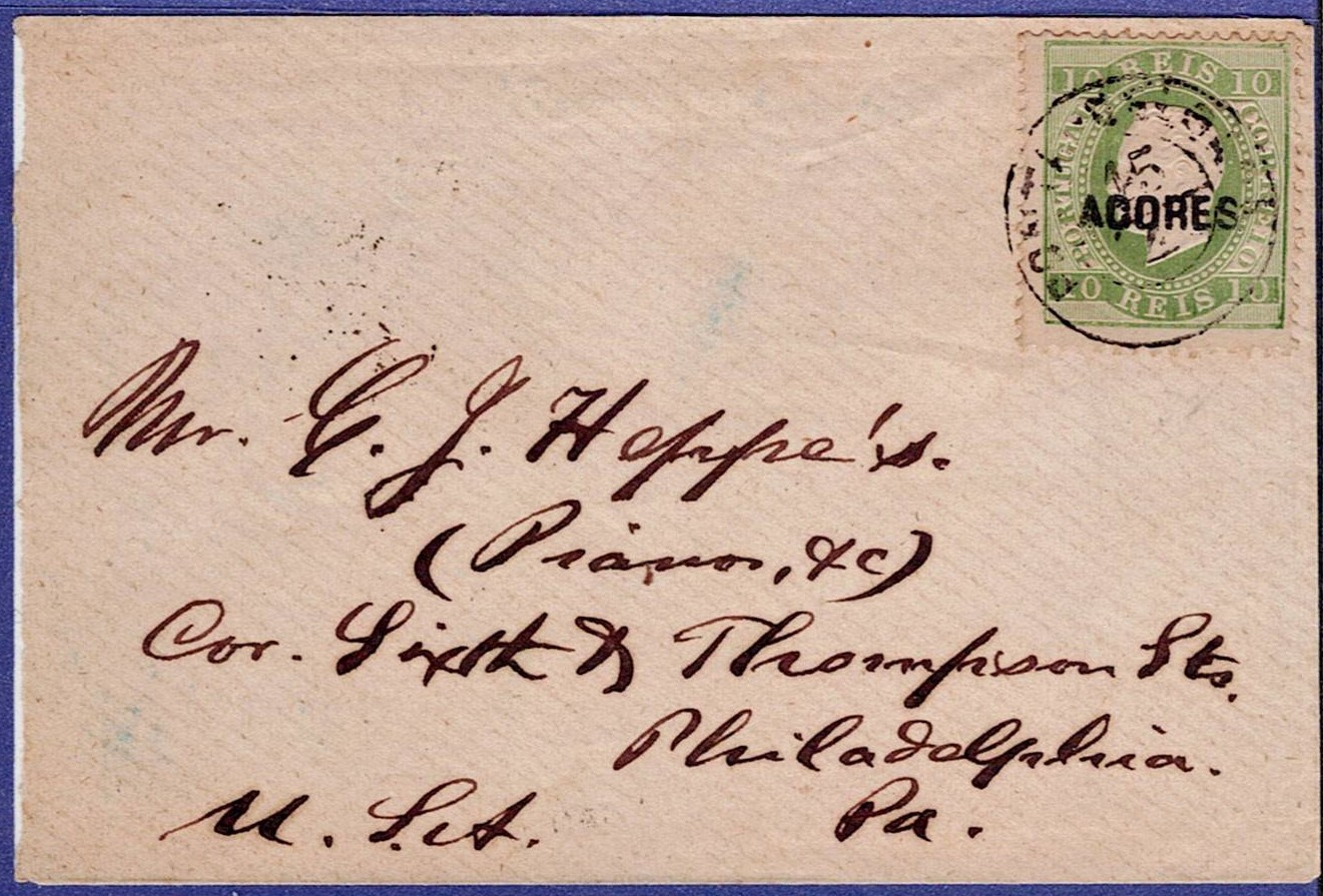 393 imageAzores letter sent from Ponta Delgada on April 15, 1882, to Philadelphia via Lisbon on April 23. Insufficient postage for the 10-reis stamp, right-hand side of D. Luis with the SC Azores, postmarked Ponta Delgada on April 15. The postage for the United States was 50 Reis, so this is a letter with a green 10-reis stamp (similar to the 50 Reis), with which it may have been confused. It is worth noting that this is the first letter we know of with the 10-reis stamp. MR and MB(Image 1)