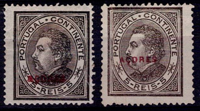 394 imageAzores 1884-87 D. Luís in profile. 2 stamps Mf#47+47a, 5 reis black, on smooth and perforated paper 12 3/4 and 11 3/4, one of them with the overprint displaced downwards. New stamps, without gum. Catalogue value €76.(Image 1)