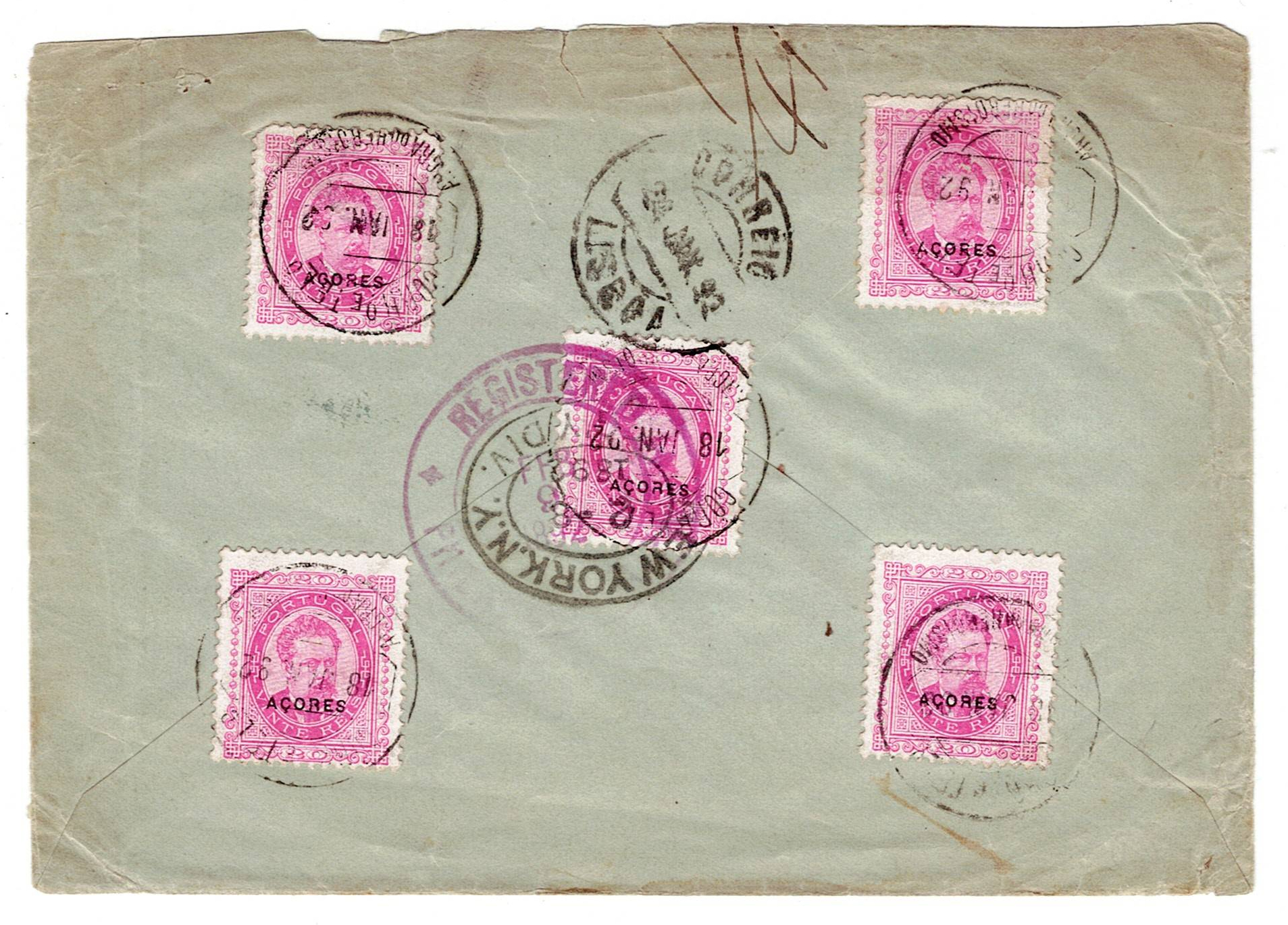 395 imageAzores. Letter registered in Angra to Philadelphia, postage of 100 Reis made by 5 stamps of 20 Reis D. Carlos overprint Azores, applied on the back, issued on January 18, 1892, by Lisbon on January 24 to the United States(Image 1)