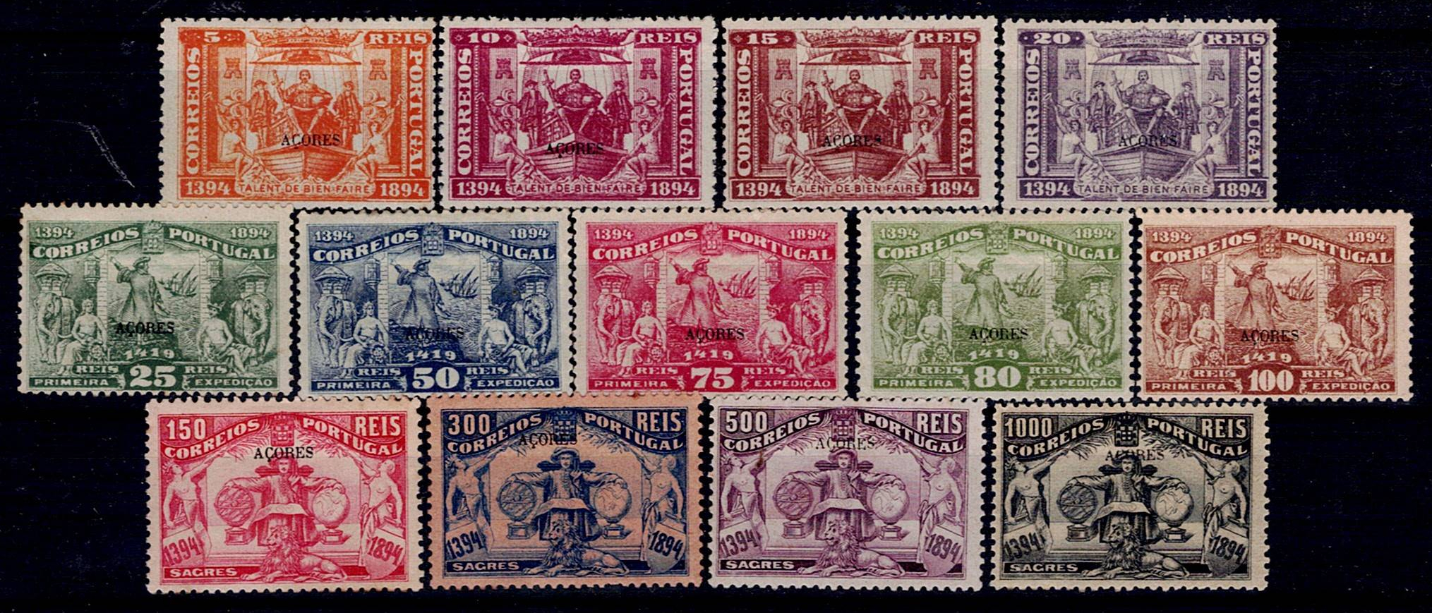 396 imageAzores 1894 5th Centenary of the Birth of Prince Henry the Navigator. Complete series of stamps Mf#60-72 on light dotted paper, perforation 14. New stamps, with non-original gum, good color. Catalog value €450.(Image 1)