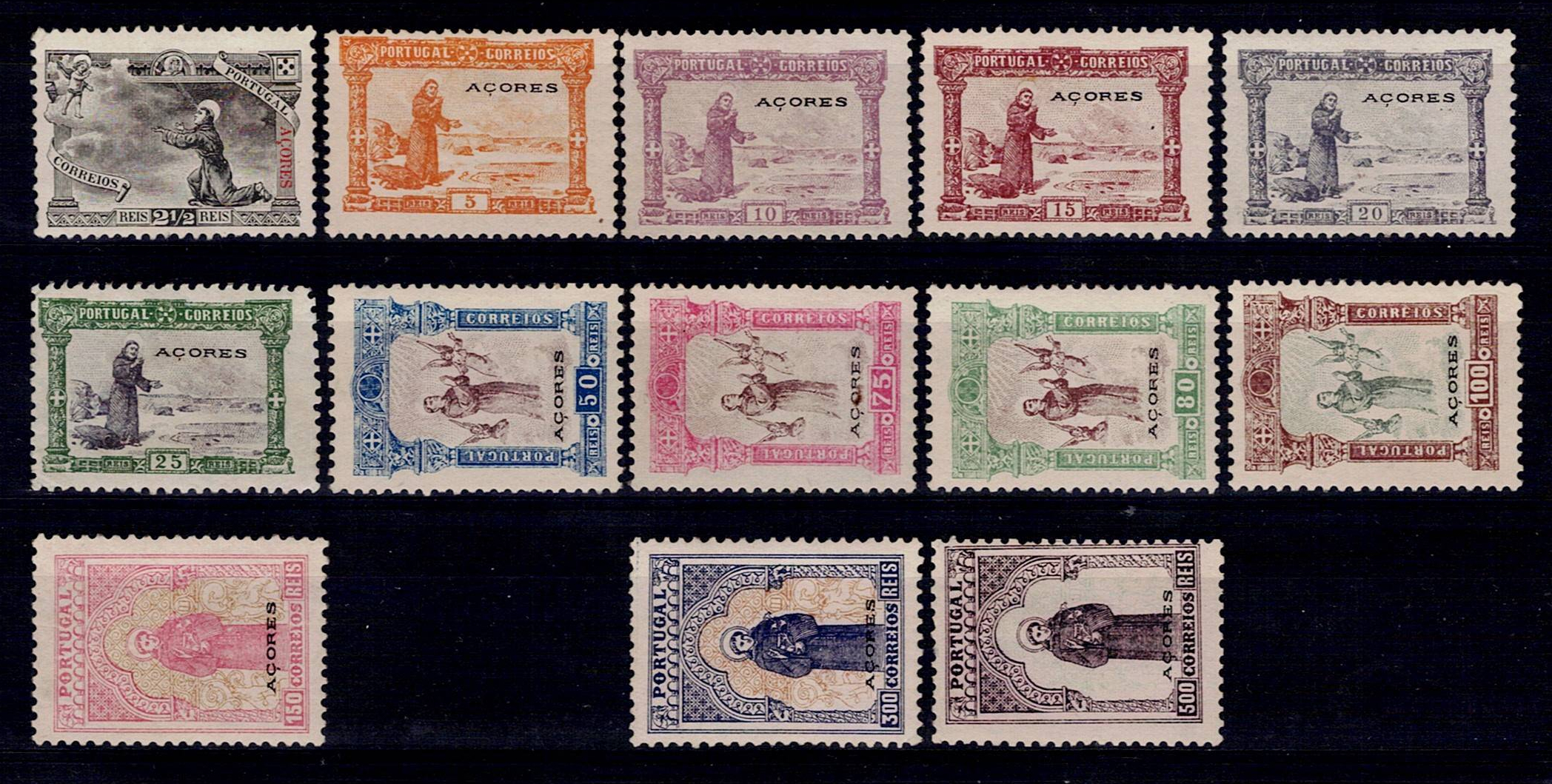 397 imageAzores 1895 7th Centenary of the Birth of St. Anthony. Incomplete series of stamps M#73-83+85+86 (missing two values: 200 and 1,000 reis). New copies, with non-original gum, in good color. Catalogue value €800.(Image 1)