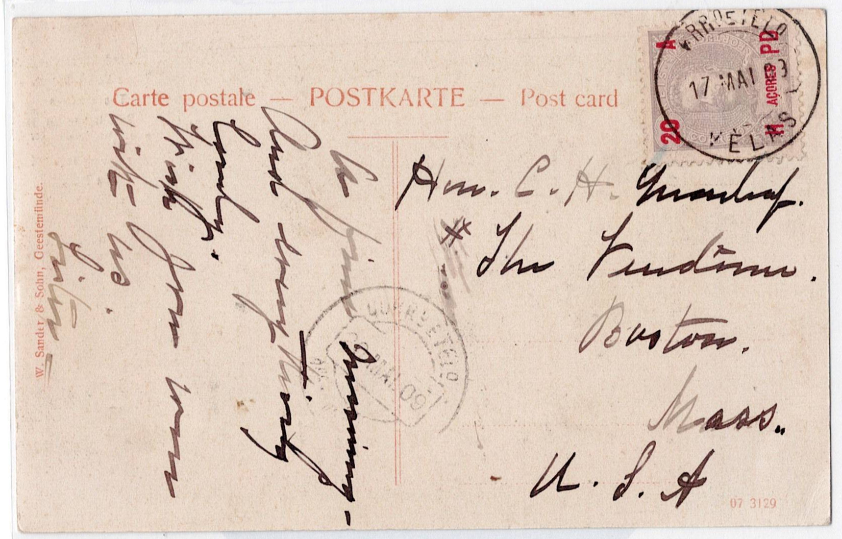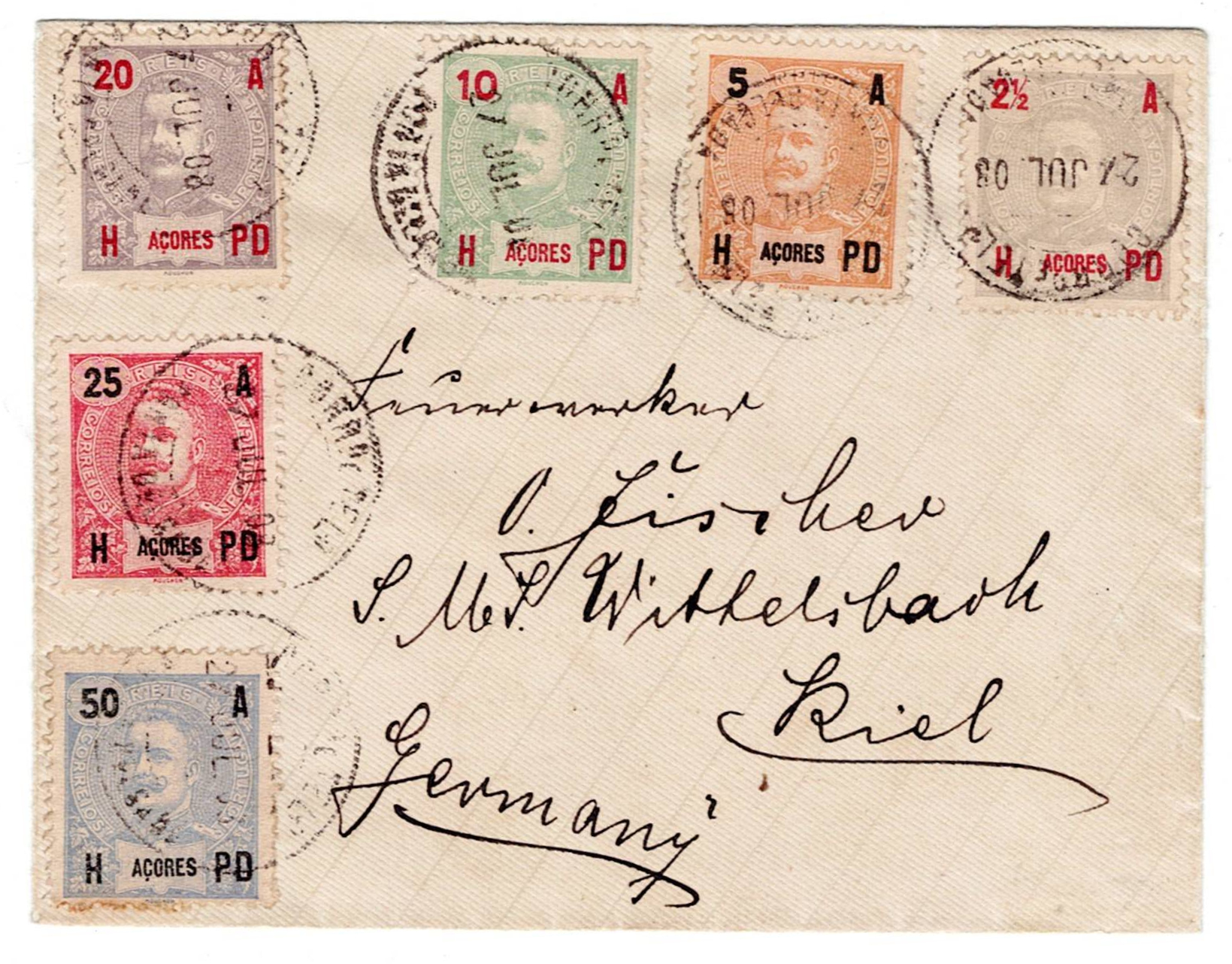 398 imageAzores. Letter issued from Ponta Delgada, 27 July 1908, postage of 112 ½ reis, to Kiel, Germany.(Image 1)