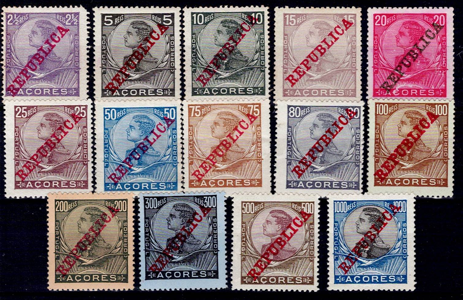 400 imageAzores 1911 D. Manuel II with Republic overprint. Complete series Mf#121-134, 14-dented enamel paper. New copies with gum and hinge or with gum and without hinge, with good color. Catalogue value €60+.(Image 1)