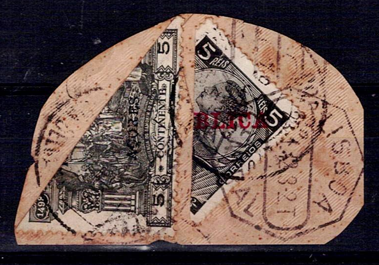 401 imageAzores 1911 D. Manuel with Republic s/c + 191-12 Postage stamp of the Mainland with Republic and Azores overprints - BIPARTITES. Fragment of a letter with stamp Mf#122, 5 r. black + stamp Mf#143 5 reis black, both BIPARTITES. Copy with CCD of "19 JAN 1912" from Ponta Delgada, over the stamps as well as an octagonal postmark (arrival postmark?) from Lisbon of 23 January.(Image 1)