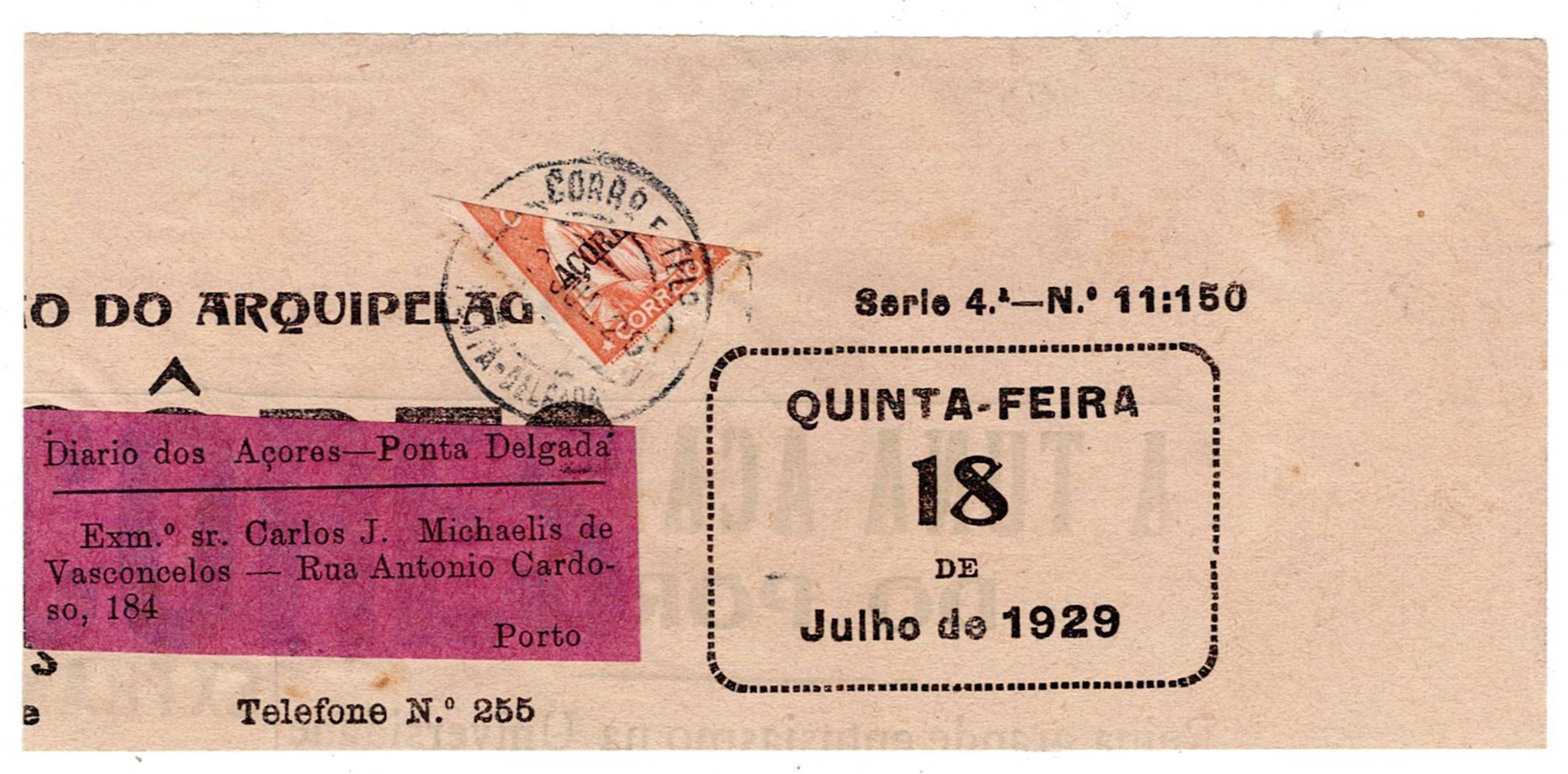 404 imageAzores 1924-28 Ceres BIPARTIDOS. Fragment of Newspaper with stamp Mf#201, 8 c. orange BIPARTIDOS. Copy of newspaper dated July 1929, with CCD of "19 JUL. 29" from Ponta Delgada, on the stamp.(Image 1)