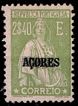 405 imageAzores * 1924/28 – Ceres. New colors and values. Stamps from the mainland with “AZORES” overprint. MF214, 2$40, silk green, porcelain paper, 12 x 11 1/2 perforation. New copy, with original gum and hinge, without defects or repairs, with good color and overprint with repainting.(Image 1)