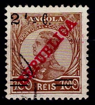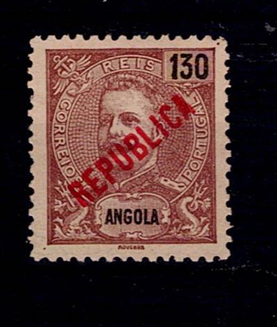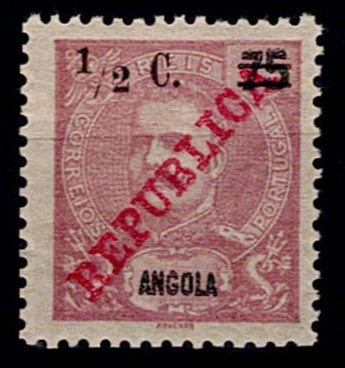 469 imageAngola 1914 D. Carlos I, with “Republic” overprint and local surcharge. Stamp Mf#188c, 1/2 cs/ 75 Reis brown violet, with short fractional stroke ERROR. New copy, with original gum and without hinge, in good color. Catalogue value €65.(Image 1)