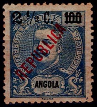471 imageAngola, 1919 – D. Carlos I, Mouchon type. With overprint and surcharge, typeset locally. Stamp MF#193c, 2 1/2 cs/ 100 reis, blue, lightly dotted paper, 11 1/4 notch with VARIETY of raised "A". New stamp, with original gum and hinge, with oxide on the reverse, without repairs, in good color. Catalog value €40.(Image 1)
