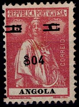 472 imageAngola 1921 Ceres with surcharge, locally typed. Stamp MF#199b, $04 s/ 15 c. mauve pink, porcelain paper, perforation 12. New stamp, with non-original gum, without defects or repairs, in good color. Catalog value €250.(Image 1)
