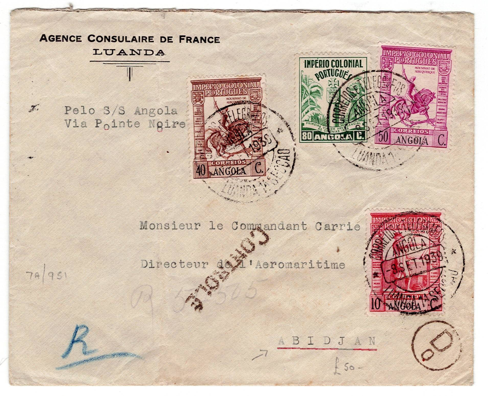 480 imageAngola. Letter from Luanda 8.9.1939, sent by SS ANGOLA, via POINTE NOIRE, 11.9, to ABIJAN, postage of 1.80 Angolares, having passed through military control(Image 1)