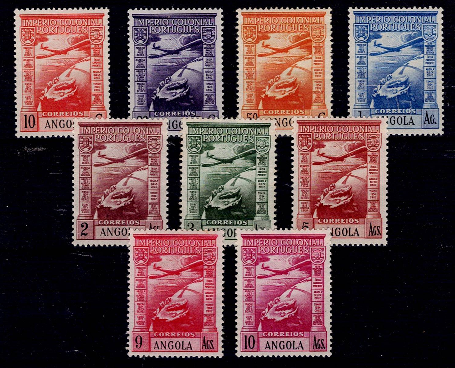 483 imageAngola 1938 – Portuguese Colonial Empire – airmail. Complete series of Mf#1-9, 13 ½ perf. New copies, with original gum and hinge, no repairs, good color. Catalogue value € 50 .(Image 1)